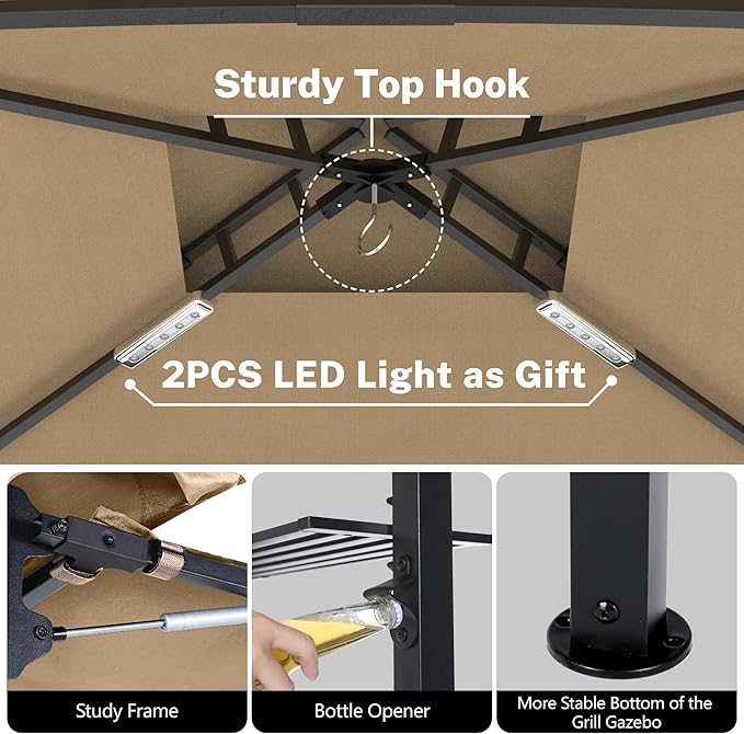 - ✅Easy to Assemble: The BBQ Gazebo can be easily assembled by 1-2 people without a ladder. Just follow the instructions correctly,assembling the top first and the leg poles last. If you have any questions, please let us know, we have a professional service team to help you.