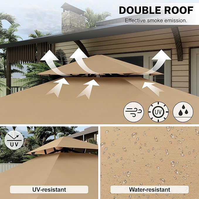 - ✅Double Roof Design: The roof is made of 50+UV material, which can effectively resist UV rays and is waterproof. The double-layer roof design can effectively exhaust the grease and smoke from the barbecue.