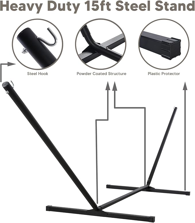 - Freestanding Hammock with Portable Stand: No damage to trees. Created to be stable and long-lasting, the 15 ft stand is made from powder-coated heavy gauge steel. It can be easily assembled in minutes without any tools, and it could be disassembled easily, making it to be a portable hammock. Feel free to contact us if you have any questions during use within one year of purchase. We are always here to help