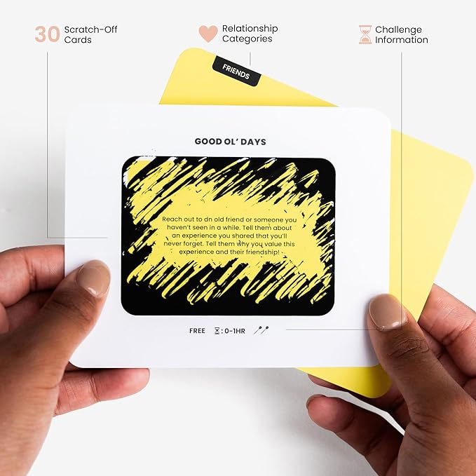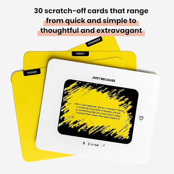 - 30 SCRATCH-OFF KINDNESS CHALLENGES – Experience the power of generosity with 30 unique kindness challenges, including 10 for family, 10 for friends, and 10 for strangers. Scratch off each surprise challenge and make someone’s day in a meaningful way