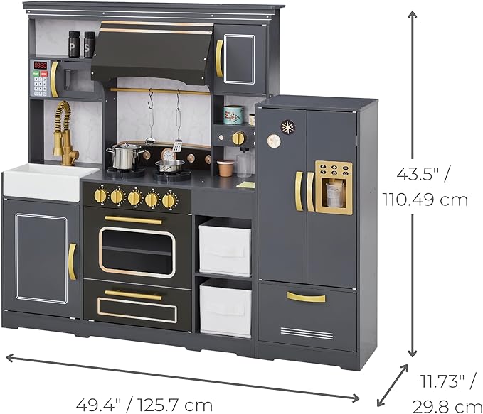 - PERFECT SIZE FOR TODDLERS: Measuring 49.4” L x 11.73” W x 43.5” H, this durable wooden kitchen fits comfortably in any playroom and is ideal for kids ages 3+.