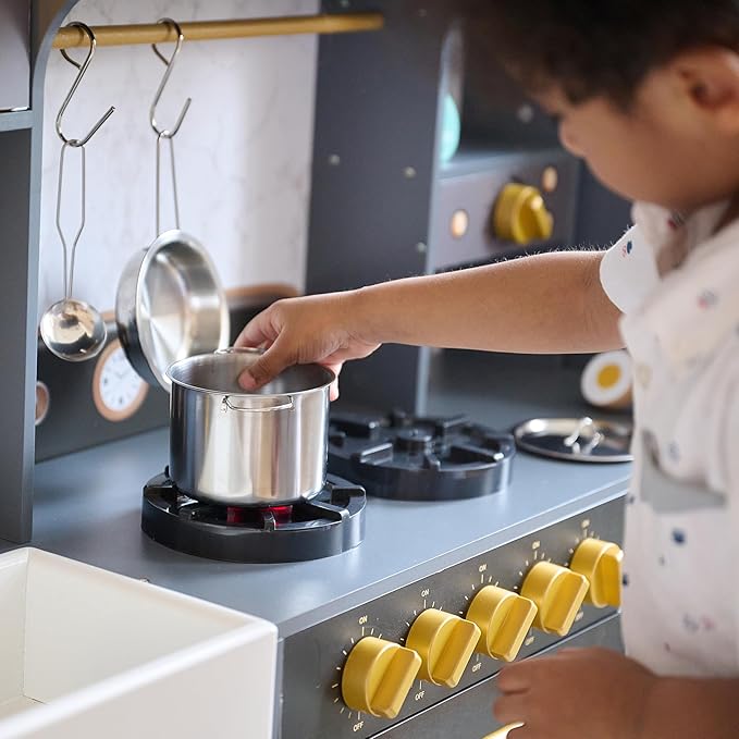 - MODERN 2-PIECE DESIGN: This gray shaker-style play kitchen includes a side-by-side refrigerator and a cooking station with golden accents for a realistic and stylish look.