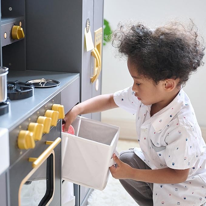 - SMART STORAGE SOLUTIONS: Keep accessories organized with upper shelves, built-in racks, and two fabric bins beside the oven for easy cleanup and tidy playtime.