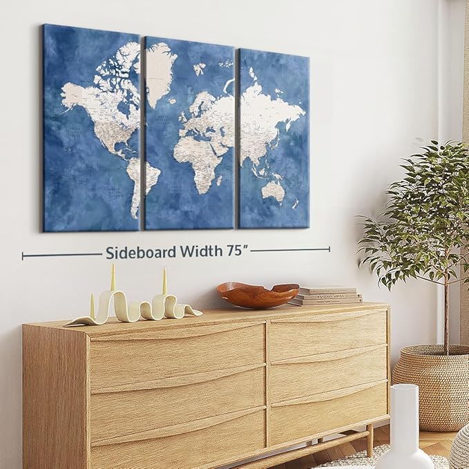 - Durable Canvas Features - Our long-lasting world map canvas is made from a non-fading UV and Humidity-resistant 330 GSM Polyester Canvas. This Detailed World Map With Cities I canvas can be used as a farmhouse living room wall art.