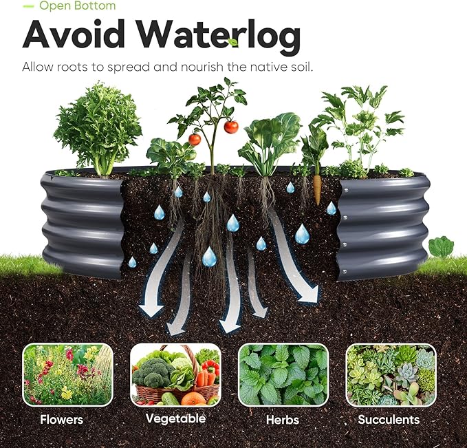 - 【Rolled Edge Design, Open Bottom】The rolled edges of the iron sheets prevent cuts during installation or planting, making it safe to use around pets and children. The open base design prevents water accumulation and rot, allowing roots to breathe better and providing a healthy environment for plant roots.
