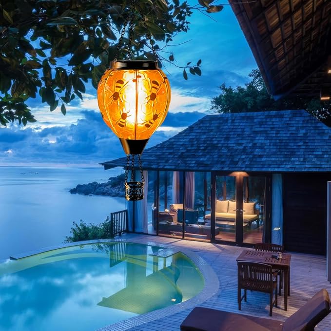 - 【Bee Hot Air Balloon Solar Lantern】This outdoor hanging solar lanterns showcases a lively honeycomb, speckled with the playful bees. When the outdoor solar lantern is lit, the flashing flame lamp make it more like a hot air balloon that is rising, creating a stunning visual effect, and also placing our good wishes to give people warmth.