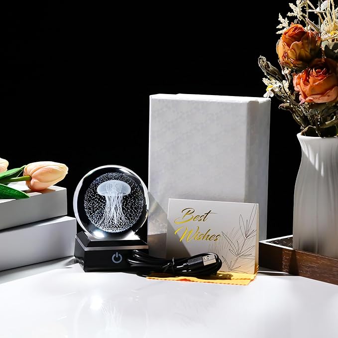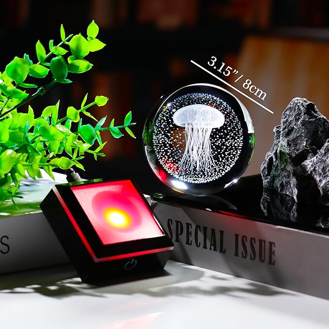 - 🍀Crystal Ball Jellyfish Lamp- Crystal Glass Jellyfish Night Light size: 3.14". Made of K9 Crystal, Interior images are carved by Advanced 3D Laser Engraving Technology.