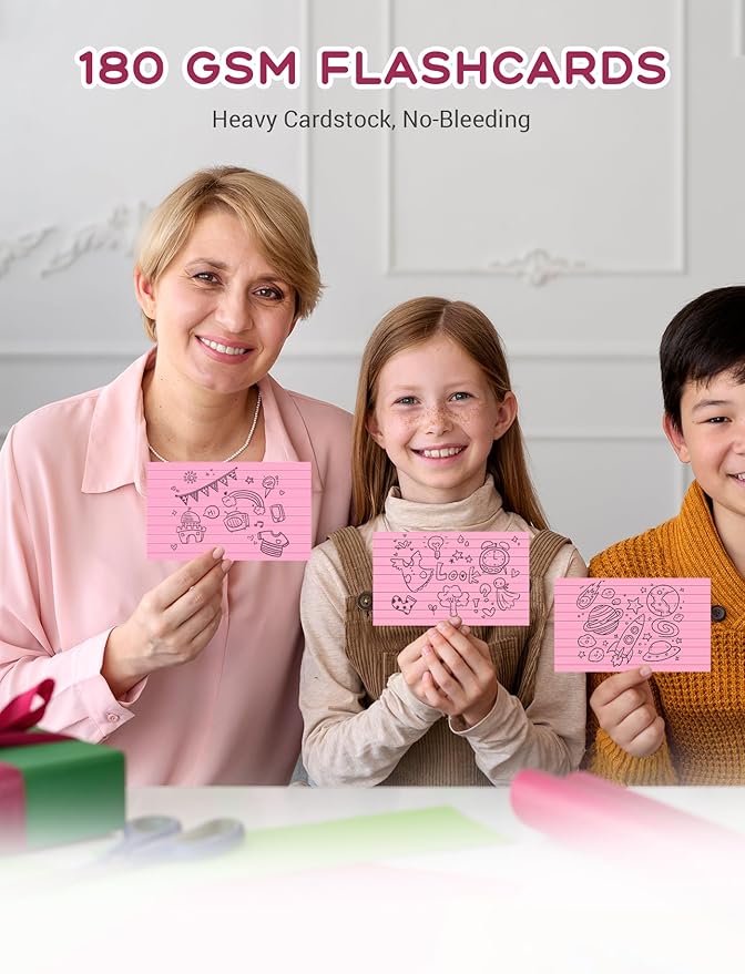 - 【STURDY AND THICK】- Comparing to other flimsy paper, our decent note cards is constructed from 180GSM heavyweight 3x5 cards, have a smooth texture that's easy to write on, which does not bleed through to the next card, support pencil, ink pens, gel pens or highlighters; Great index cards use for studying, language learning, school flash cards, color-coding project. Let your imagination run wild with the versatility of our ruled index cards 3x5.