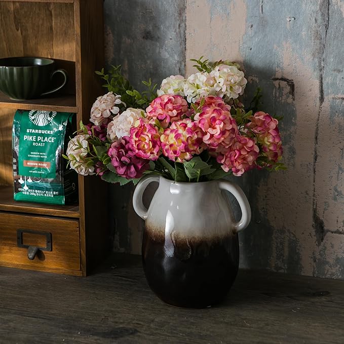 White Gradient Ceramic Vase with 2 Handles, Modern Farmhouse Decor, Rustic Terracotta Pottery, Decorative Flower Vases, Clay Small Vase, Centerpiece for Dining Table - 7 Inch Tall