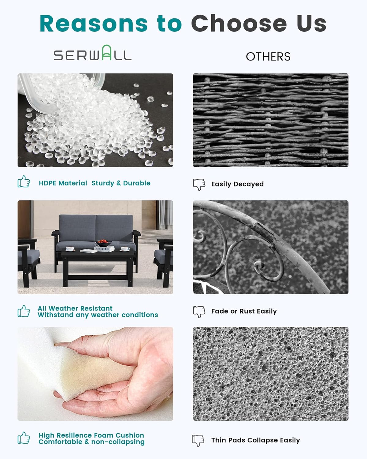 - After-sales Support: We want our customers to be 100% satisfied with serwall outdoor furniture - you can always come to us for any product questions and product care, we are committed to your satisfaction.