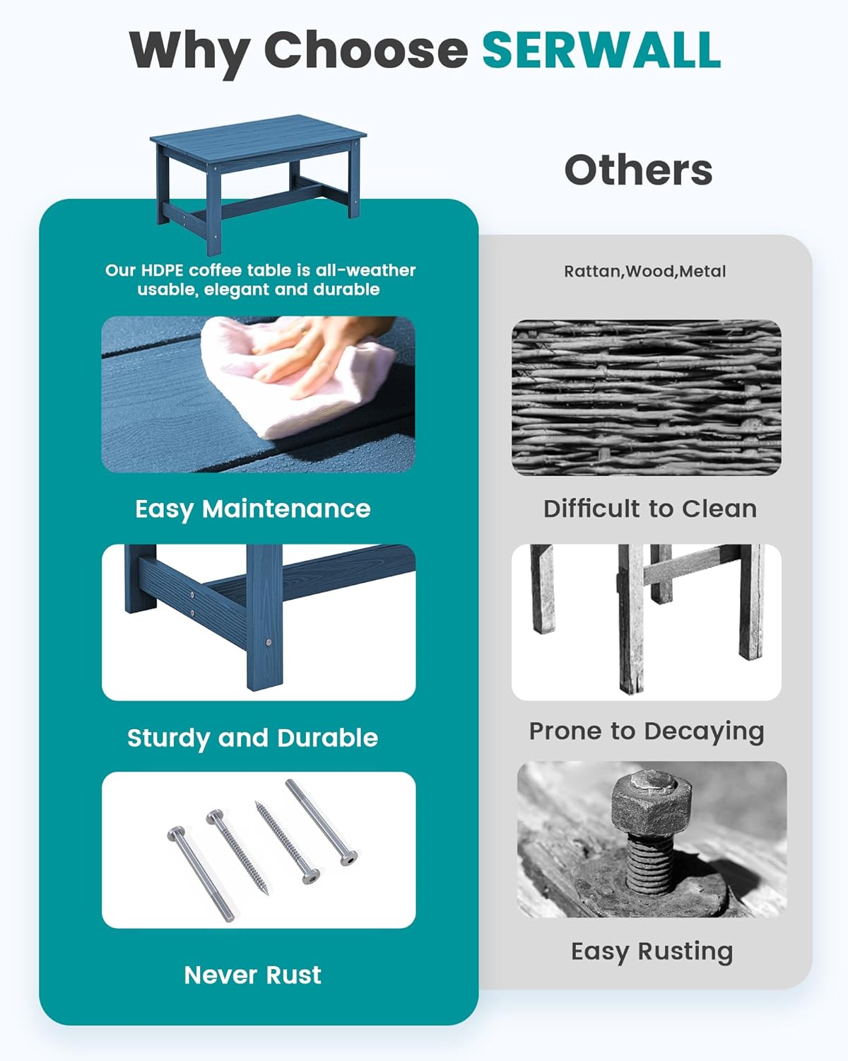SERWALL HDPE Outdoor Coffee Table, All-Weather Patio Coffee Table, Rectangle Adirondack Outdoor Table Fits with Outdoor Sectional Couch for Outside Deck Porch Lawn, 37.8" x 22.8", Blue