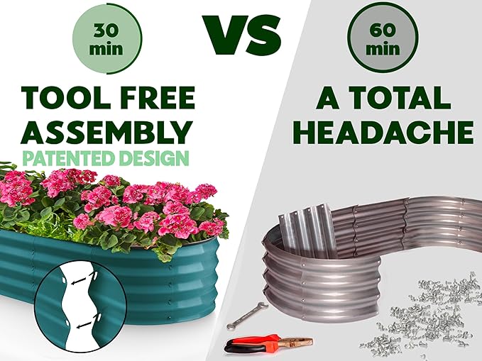 - EFFORTLESS ASSEMBLY, LIKE NO OTHER! Begin your planting journey by choosing our innovative patented design, featuring the perfect combination of easy assembly and durability. Thanks to our unique tool-free design, assembly is a breeze and can be completed in just 30 minutes! Get started on your garden right away and enjoy fresh, healthy produce in no time.