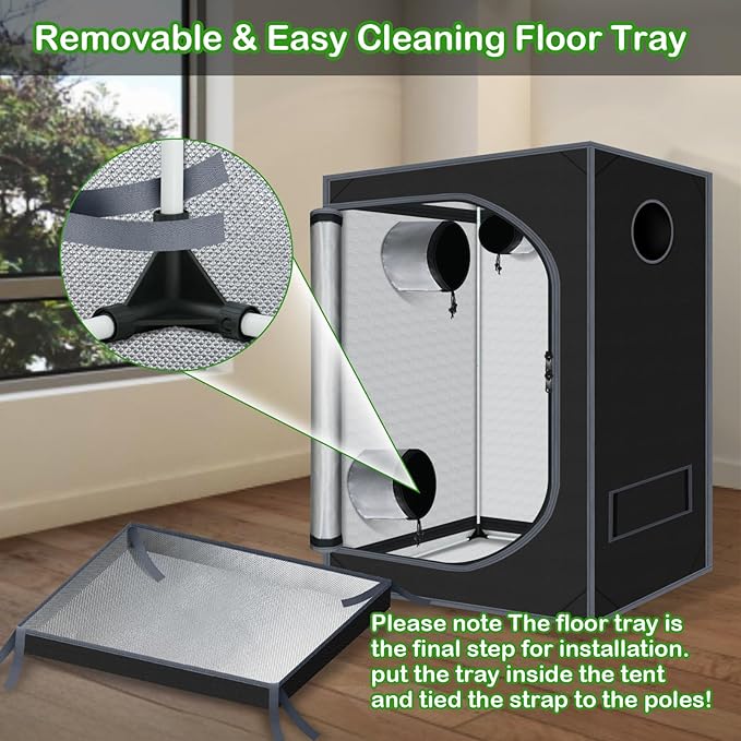 - Upgrade Design --- UPGRADED CONNECTOR--Durable PA Material Adopted, Anti-rust Reinforced Design, Adjustable Tightness According to The Pole, Hold Poles Tightly for Firmed Support. Multiple vents to accommodate fans and filter; ducting rectangle window with mesh to keep dust and insects out; Removable mylar floor tray easy to clean.