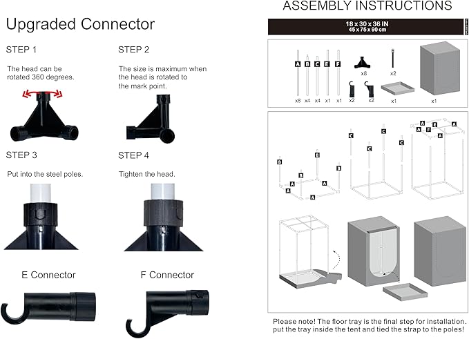 - Upgrade Design --- UPGRADED CONNECTOR--Durable PA Material Adopted, Anti-rust Reinforced Design, Adjustable Tightness According to The Pole, Hold Poles Tightly for Firmed Support. Multiple vents to accommodate fans and filter; ducting rectangle window with mesh to keep dust and insects out; Removable mylar floor tray easy to clean.