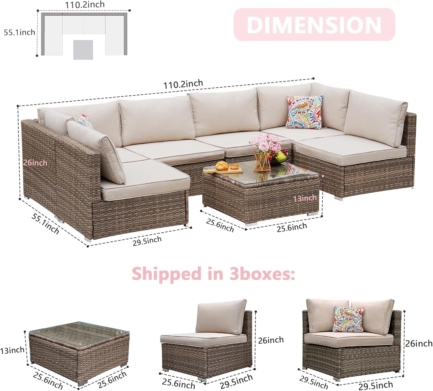 7 Pieces Patio Furniture Set - All-Weather Outdoor Wicker Sectional Conversation Sofa, Rattan Patio Seating Sofa Set with Cushion and Glass Table for Porch Poolside, Brown/Beige