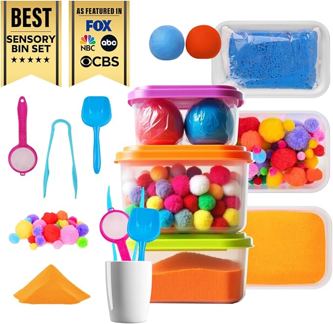 - Complete Kit; Each kids sensory bin comes with a different sensory bin filler; We’ve included colored beads, feathers, pompoms, sensory clay and even sand in this total sensory play experience; Better still, we’ve even included extra sensory tools like pickers, strainers, scoops and more