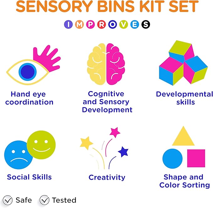 - Cognitive Development; More than just a kit of sensory bin toys, this set of toddler sensory bins can help expand your child’s social and cognitive skills; Encourage your child to sort sensory toys by shape and color while talking to them and engaging in discussion about sharing and collaboration