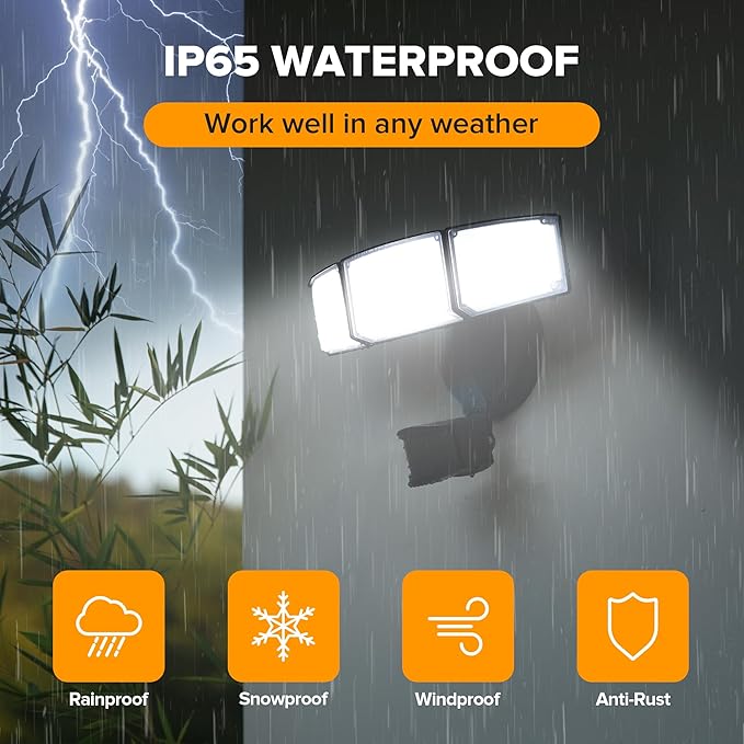 - 【49W BRIGHTNESS AND ENERGY SAVING】: The security lights equipped with high quality LED beads, ensuring it to produce up to 5500 lumens 5000K light at low power of 49W. With optical filter lenses and 3 head design, provides comfortable and extensive illumination. Saves over 88% on electricity compare to halogen light