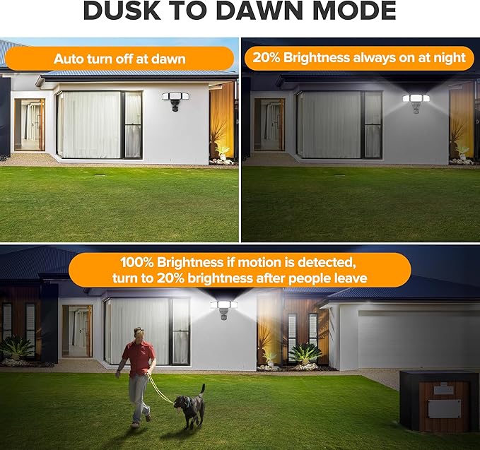 - 【4 LIGHTING MODES】: The outdoor flood lights features 4 versatile lighting modes to meet your different needs: ① 100% brightness when motion is detected at night; ② Maintains 20% brightness at night, up to 100% brightness with motion activated; ③ 6 hours constant illumination, 100% brightness day or night; ④ Test Mode. Suitable for the porch, garage, backyard, driveway, walkway, front door, etc