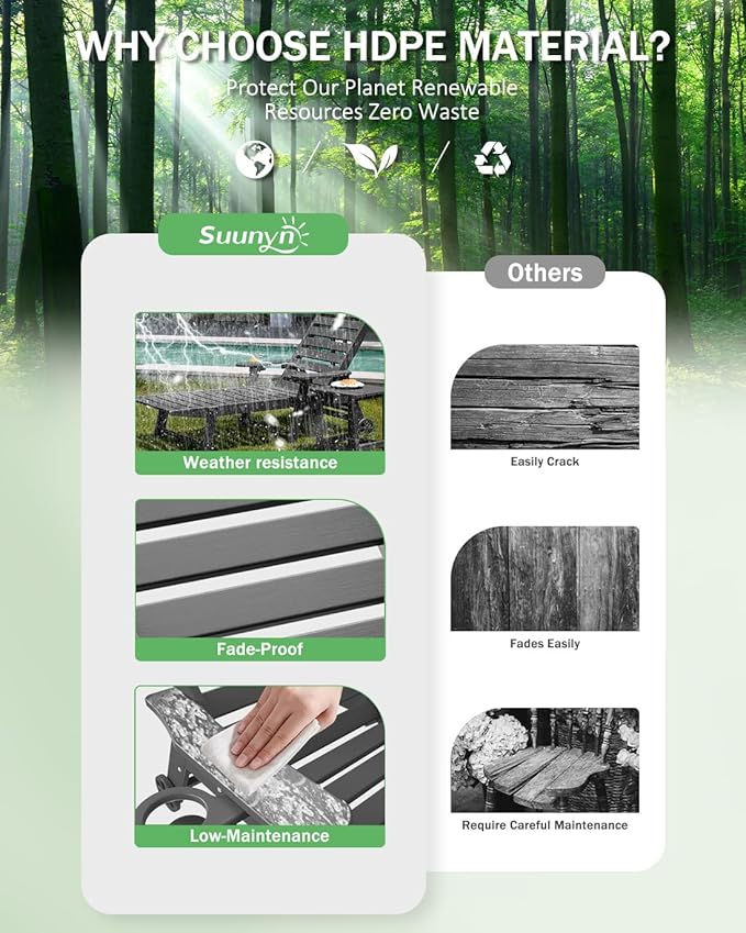 - Premium Suunyn HDPE: The polywood chaise lounge are made from high-density HDPE, which bends slightly under heavy weight or high temperature but returns to its original shape when the weight is removed or the temperature has dropped. This durable material withstands harsh weather and is easy to clean