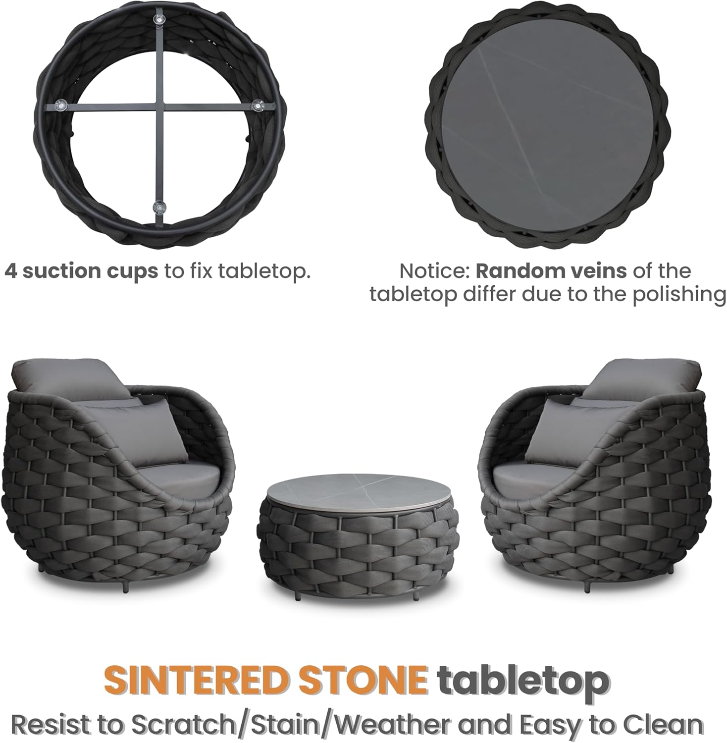- Furniture set is crafted from reinforced rust-free aluminum alloy frame, wrapped in hand woven polyester rope. The 3 pieces all weather patio upholstered conversation set resists to UV, rain, wind, salt water. Perfect for indoor outdoor even arid or coastal areas