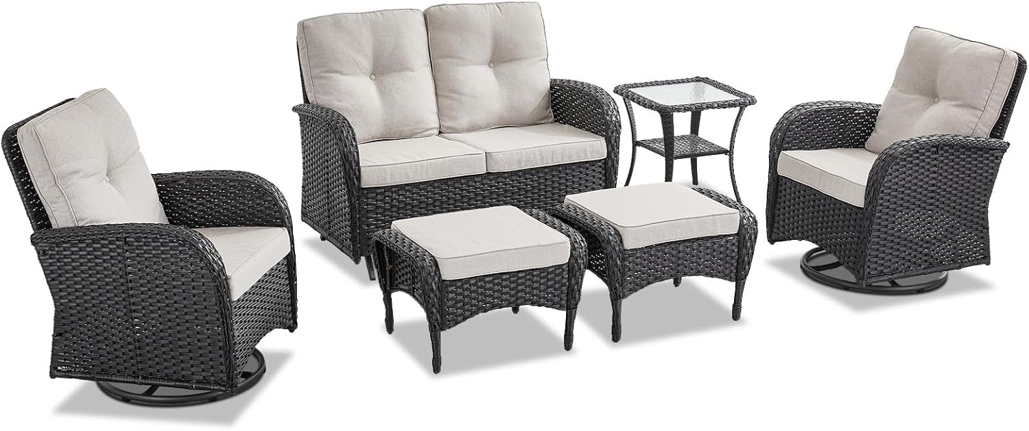 - 4.LUXURIOUS OUTDOOR RETREAT ENSEMBLE: Relax in the beautiful outdoors with this perfect 6 pieces patio glider furniture set. Our patio swivel rocker chair set with high quality foam cushion, comfortable and soft rebound good. The cushion cover is made of olefin outdoor water-resistant fabric. The seat and backrest are made of beautifully woven wicker coupled with ergonomic design, making it a classic upgrade for any porch, deck or patio.