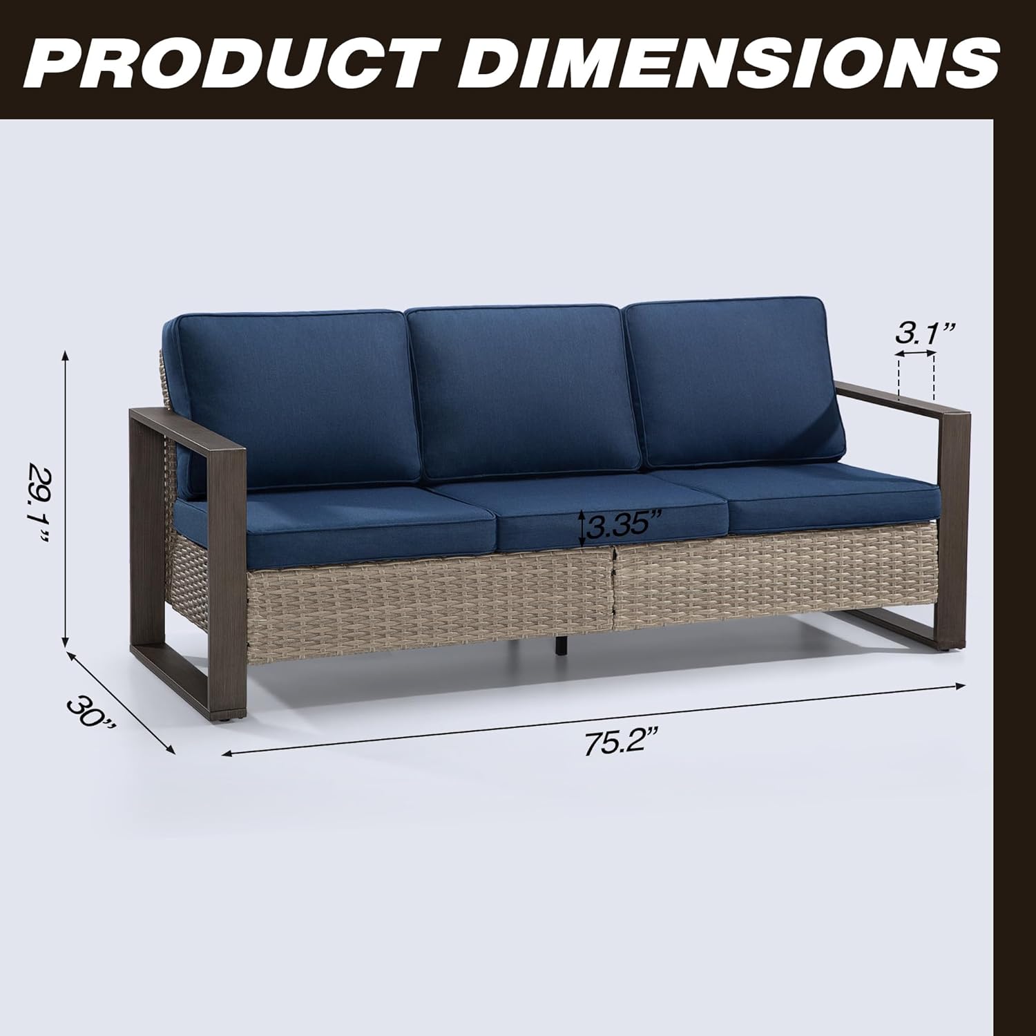 Joyside Outdoor Patio Wicker Sofa, 3-Seater Rattan Sofa with Thick Olefin Cushions and Metal Steel Rectangular Framed Armrest -Looking Metal Armrest Suitable for Garden, Backyard, Porch, Deck (Blue)