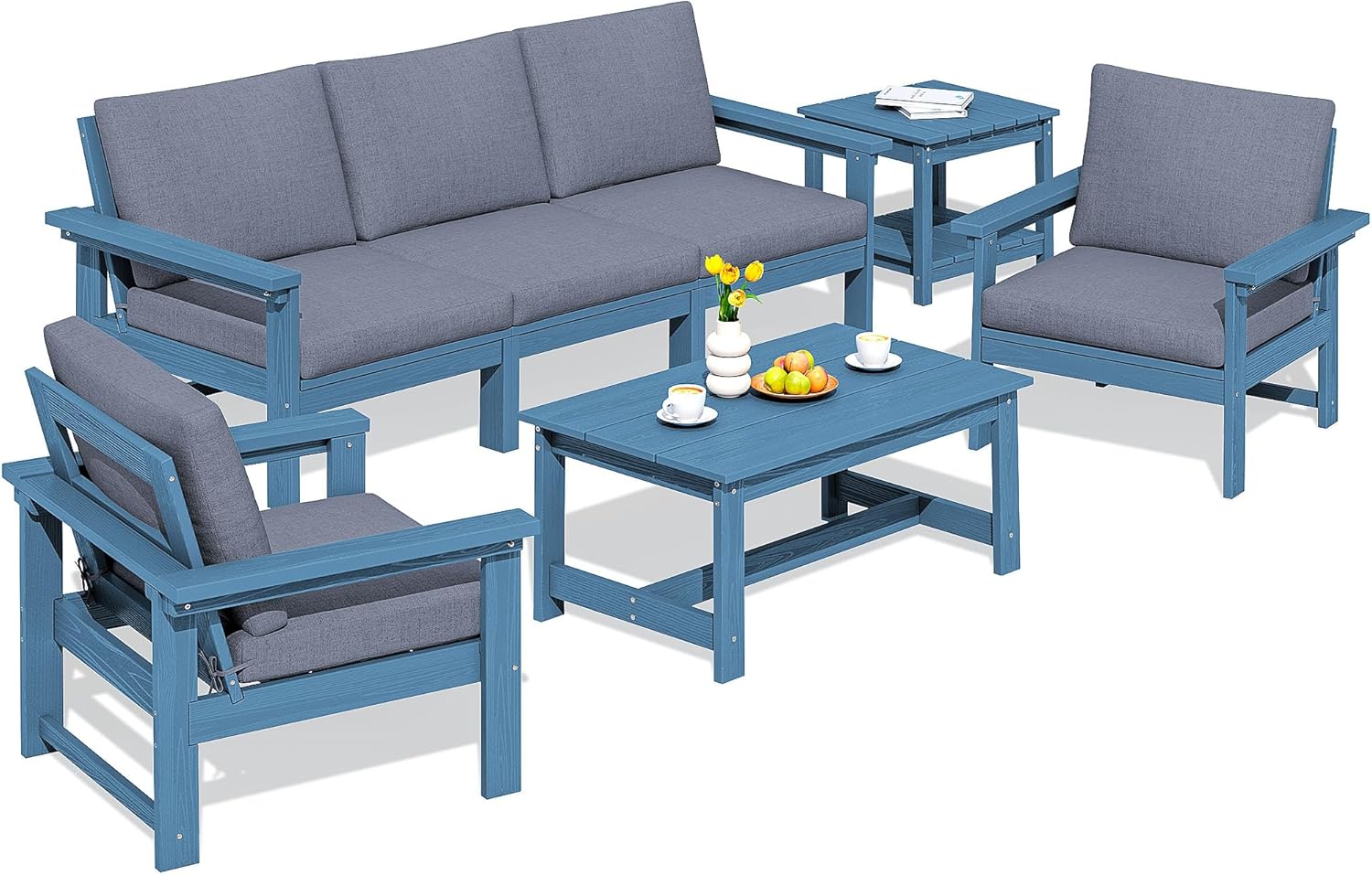 SERWALL HDPE Patio Furniture Set, 7-Piece Outdoor Sectional Sofa Set, All Weather Outdoor Couch Set for Deck, Lawn, Blue Frame with Grey Cushion