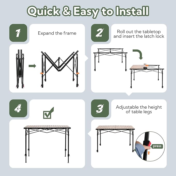 - Portable and Easy to Install: The camping table features a folding design, allowing it to be quickly and easily set up or folded without tools, saving you time and space. The folded size is 33"L x 11"W x 4.7"H. After folding, store it in the carrying bag for convenient outdoor transport and storage; it can easily fit in the back of a car, RV, or motorcycle.