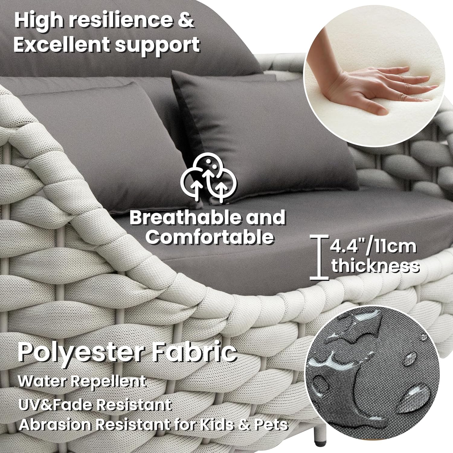 - Filled with 4.3"/11cm thick high-density sponge and cotton, cushions are soft touching and breathable for a refresh comfy patio seating holding its shape in long time using. Water repellent and abrasion resistant polyester fabric also fits families with kids and pets