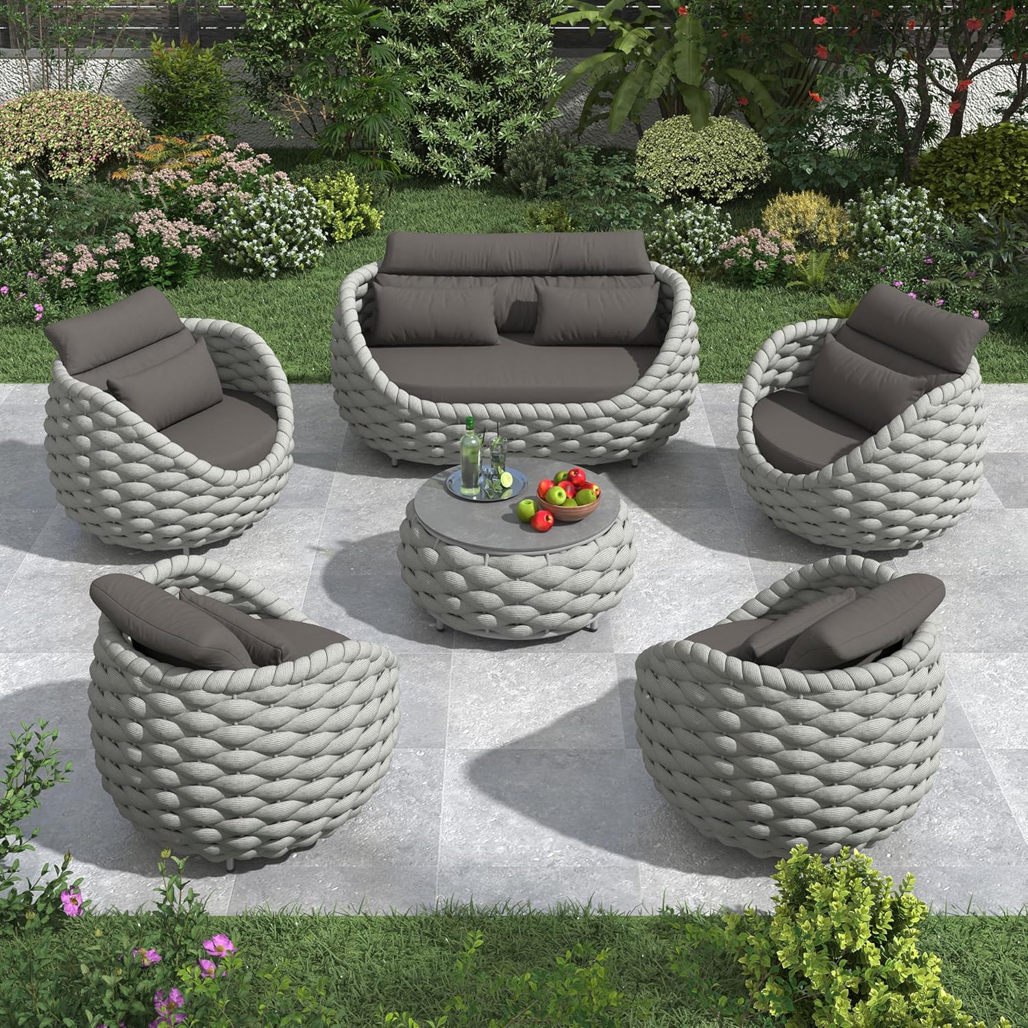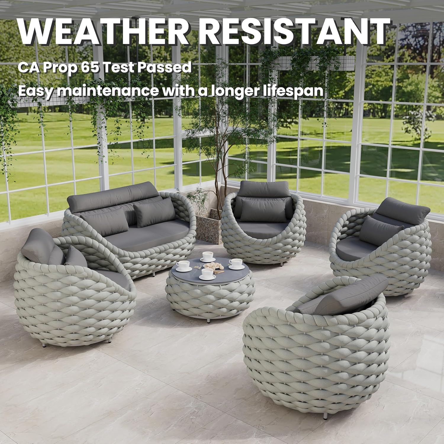 - Furniture set is crafted from reinforced rust-free aluminum alloy frame, wrapped in hand woven polyester rope. The 6 pieces all weather patio upholstered conversation set resists to UV, rain, wind, salt water. Perfect for indoor outdoor even arid or coastal areas