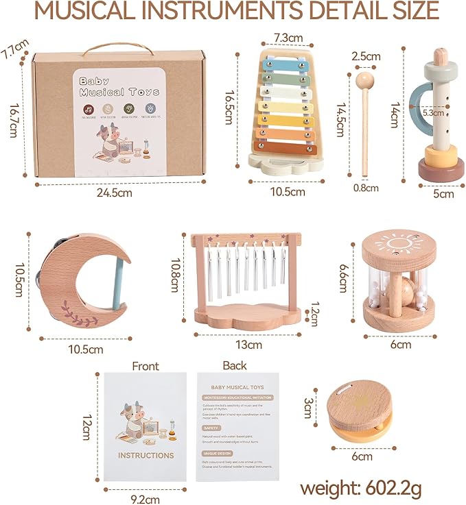 - 【Perfect Gift】Are you struggling to send your child a cute gift? The designer has created a cute cover for the music instrument set, and the hand-held packaging is perfect for gift giving. The wooden music instrument toy is a perfect gift for 3 years old kids in birthday,children's party, Christmas and other holidays.