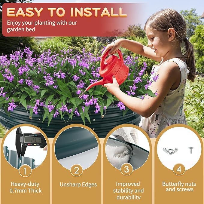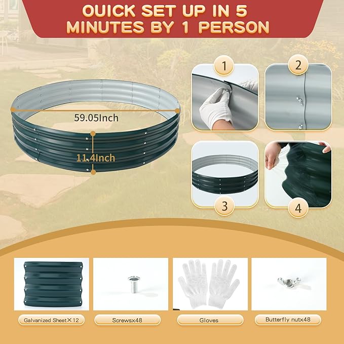 - 【DURABLE & STABLE】: ZBZBML round raised garden bed (5×5×1ft) is 60 IN Diameter,11.8IN Tall, each is made of 0.7MM thick Q195 galvanized metal sheet painted, double-layer anti-corrosion galvanizing and round structure design,it is built to providing a solid foundation for your plants.