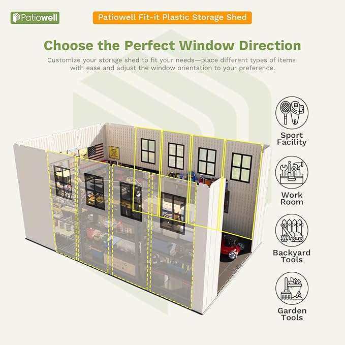 - Window Design: The window allows natural light to enter, reducing the need for additional lighting. It provides a pleasant view and enhances security by offering a clear view of the shed’s contents. Additionally, the window’s position can be adjusted to suit your needs using the wall panel.