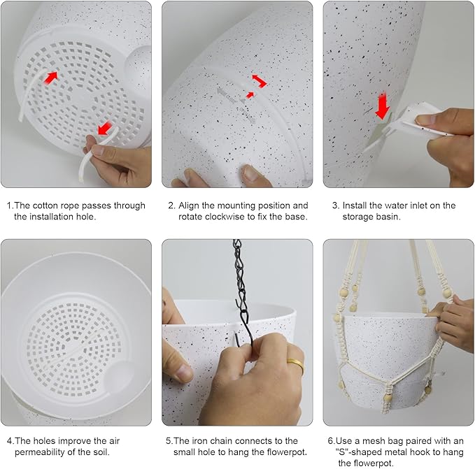 • 【Self-Watering Hanging Planter with Removable Tray】This hanging flower pot comes with a detachable bottom tray that acts as a water reservoir, holding a good amount of water. When your plant needs water, it’s absorbed through cotton wicks from the reservoir to the soil, reducing how often you need to water