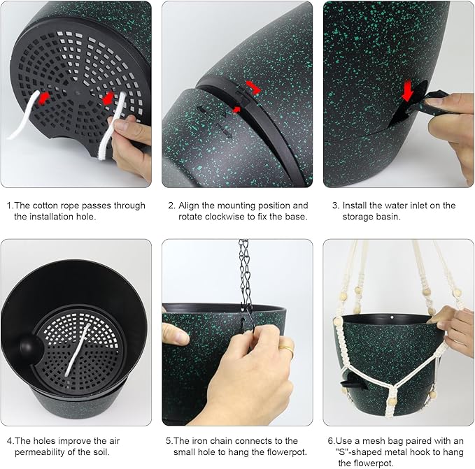 - 【Self-Watering Hanging Planter with Removable Tray】This hanging flower pot comes with a detachable bottom tray that acts as a water reservoir, holding a good amount of water. When your plant needs water, it’s absorbed through cotton wicks from the reservoir to the soil, reducing how often you need to water