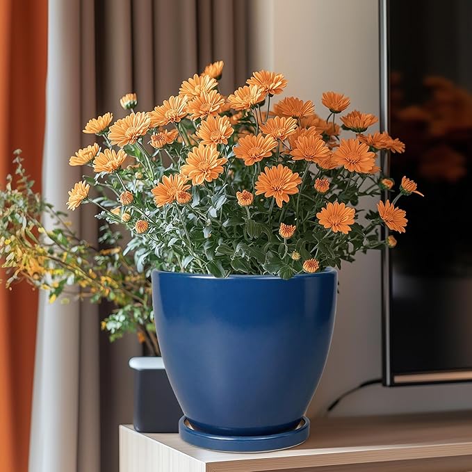 Ceramic Plant Pot - 8 Inch Planter for Indoor Outdoor Plants, Round Flower Pots with Drainage and Tray, Home Office Decor, Blue