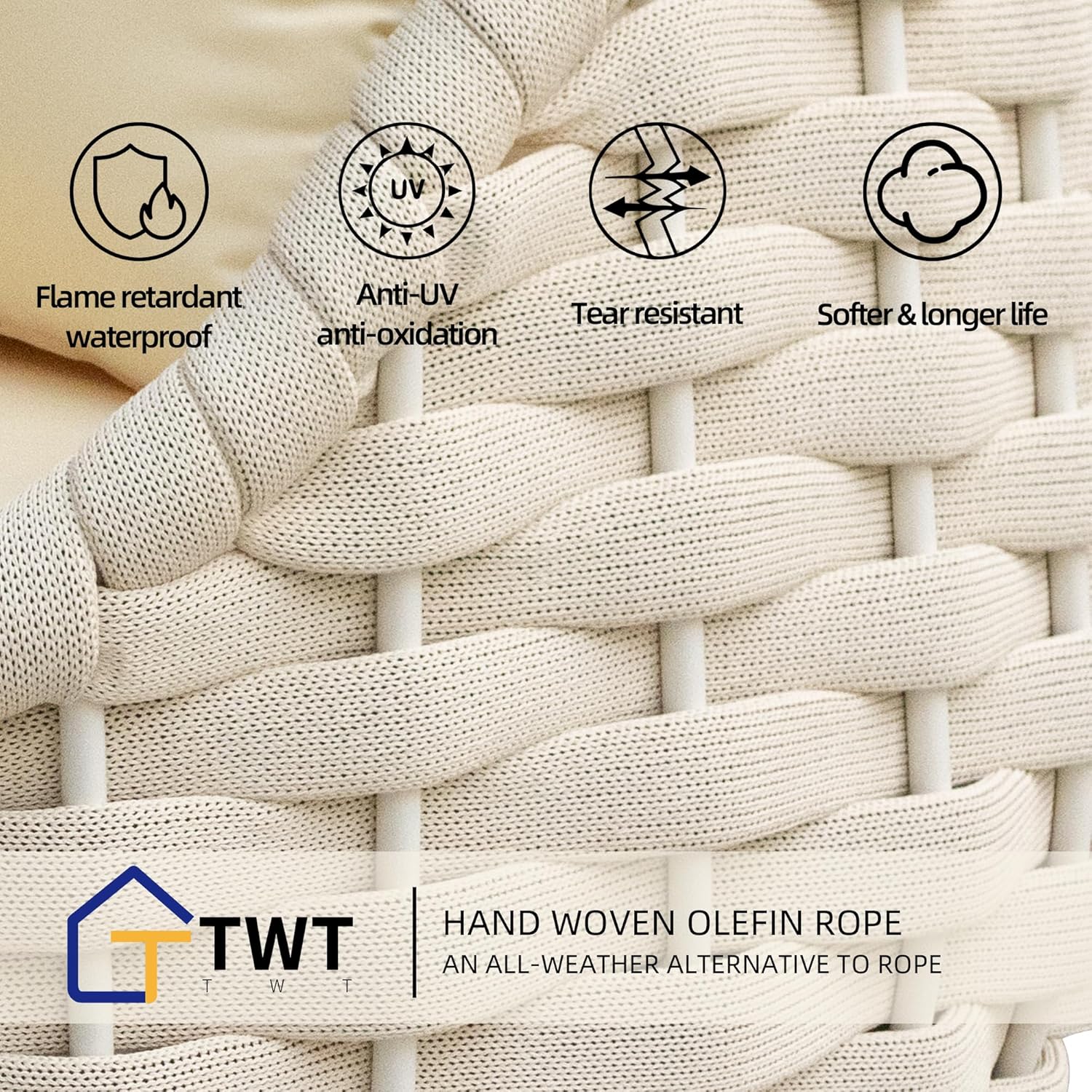 - NO required assembly & easy to clean:Our outdoor couch NO required assembly, just take them out and use. TWT patio chairs’ seat are easy to clean and polyester rope relatively soft. No need to take more extra special care to maintain patio couch