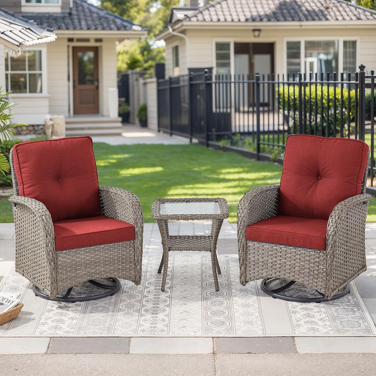 HUMMUH 3 Piece Outdoor Rocking Chairs Bistro Set-All Weather Wicker Outdoor Swivel Chairs Set of 2 with Side Table Small Patio Furniture Set for Deck Lawn Porch Balcony Poolside-Grey/Red