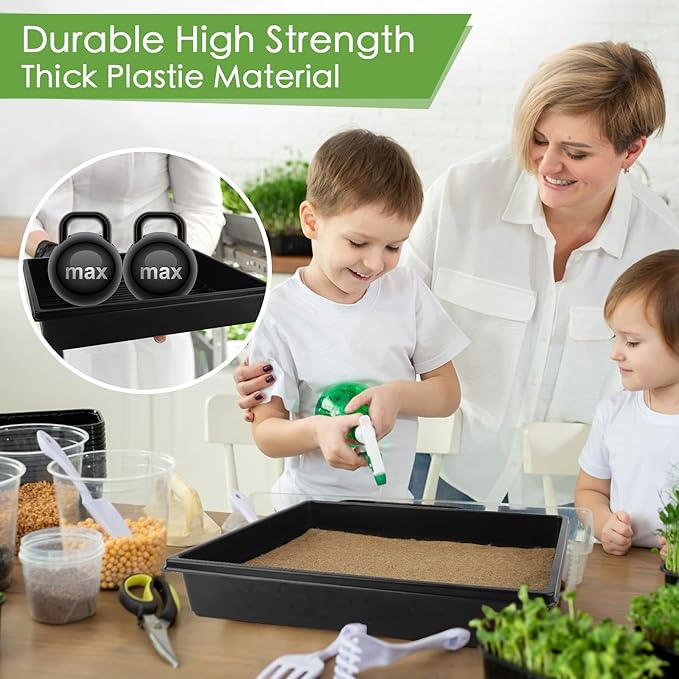 - [Large Size for Bountiful Harvests] Each microgreens growing tray measures 15 x 11 x 2.5 inches, providing ample space for growing a variety of microgreens such as wheatgrass, kale, or arugula. The spacious design supports better root development, resulting in higher yields. Whether for home use or small-scale commercial planting, this microgreens growing kit is designed to help you achieve abundant growth.