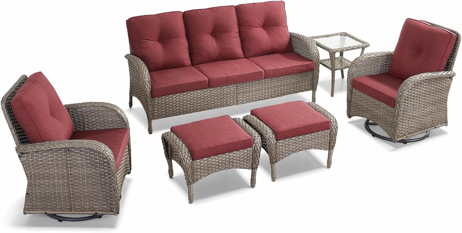 HUMMUH 6 Pieces Outdoor Patio Furniture-PE Rattan Wicker Sofa with Patio Swivel Rocking Chairs Patio Furniture for Deck Lawn Porch Balcony Poolside-Grey/Red