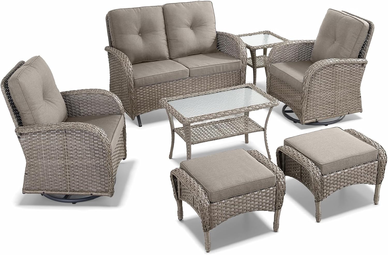 HUMMUH 7 Pieces Wicker Patio Conversation Set Outdoor Glider Loveseat with Patio Swivel Rocking Chairs Outdoor Patio Set for Deck Lawn Porch Balcony Poolside-Grey/Grey