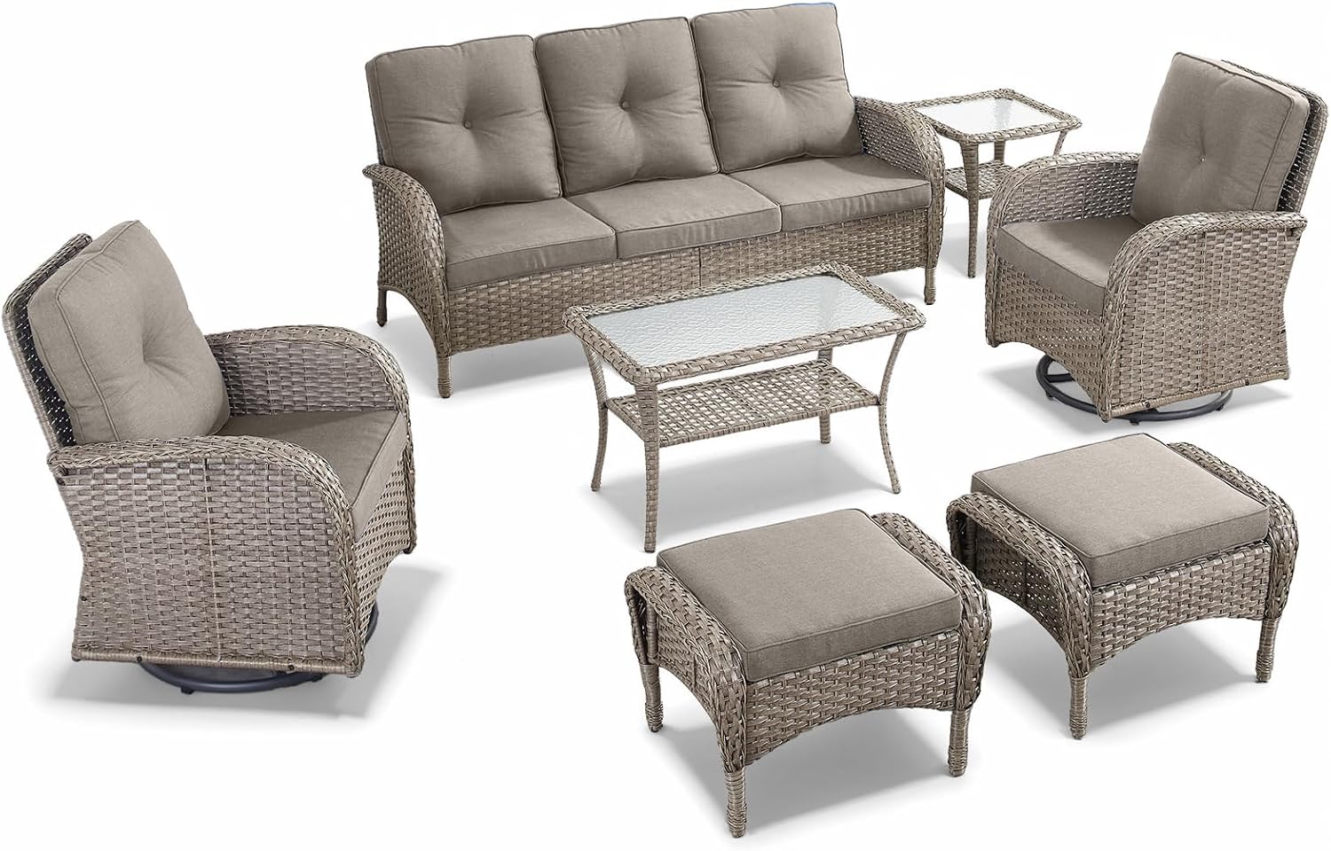HUMMUH 7 Pieces Outdoor Furniture Set-All Weather Wicker Rattan Couch with Outdoor Rocking Chair Patio Furniture for Deck Lawn Porch Balcony Poolside-Grey/Grey