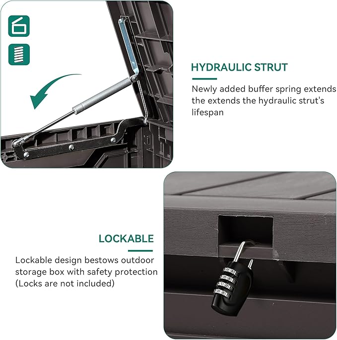 - Convenient Design: The resin outdoor storage features hydraulic struts for smooth, slow, and safe opening and closing, with dual side handles for effortless movement, whether by yourself or with a friend