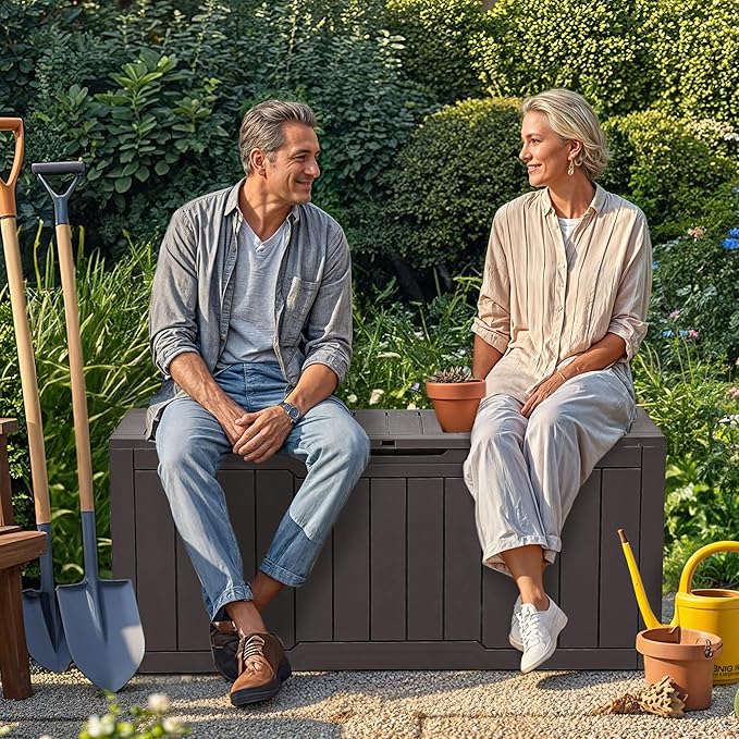 - Extra Seating: Doubling as a comfortable bench seat, this plastic deck box can support up to 485 pounds; Set it up in just 15-30 minutes, and enjoy its unique wood-grain texture that seamlessly blends with any patio or deck decor in no time