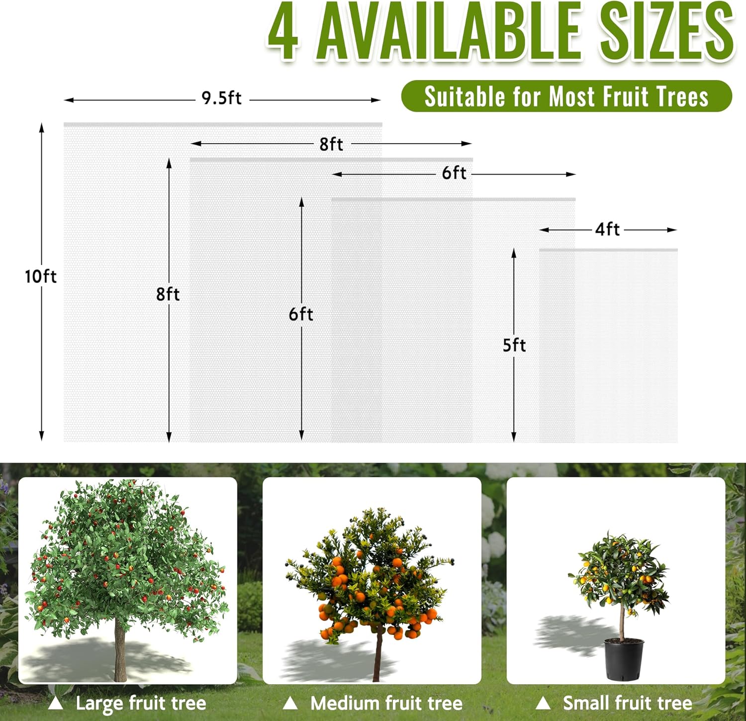 - Large Sizes for Most Bushes: Garden mesh netting is available in 4 sizes, respectively are 4 x 5ft, 6 x 6ft, 8 x 8ft,10 x10ft large enough to cover various plants such as blueberry bushes, citrus, shrubs, tomatoes, cherries, dwarf dogwood, flower trees