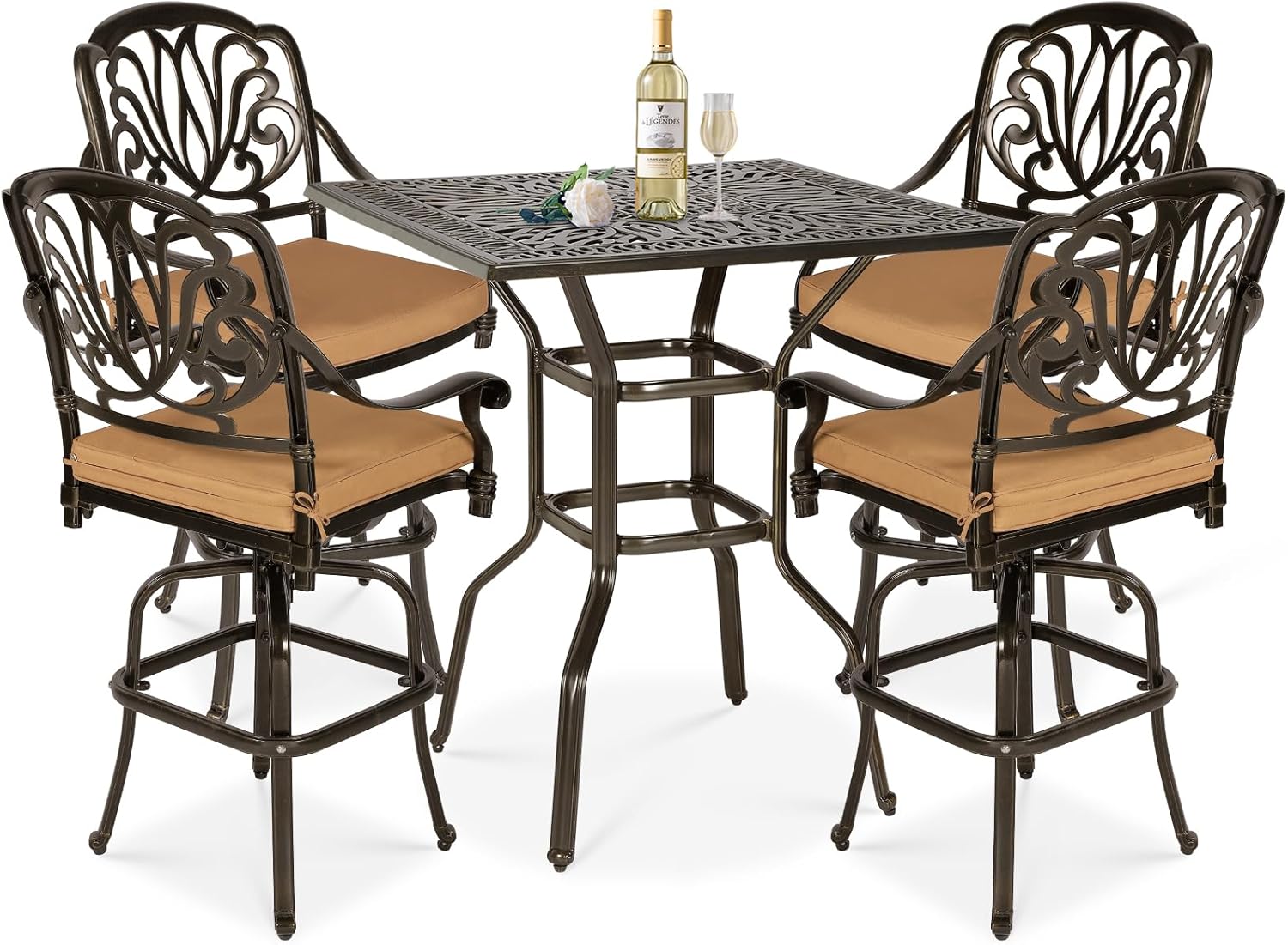 5 Pieces Patio Swivel Bar Set, Patio Bar Table and Chairs Set, All-Weather Cast Aluminum Outdoor Swivel Bar Stools of 4 and 35.4" Square Bar Table, High Top Bistro Set for Deck, Pool, Garden