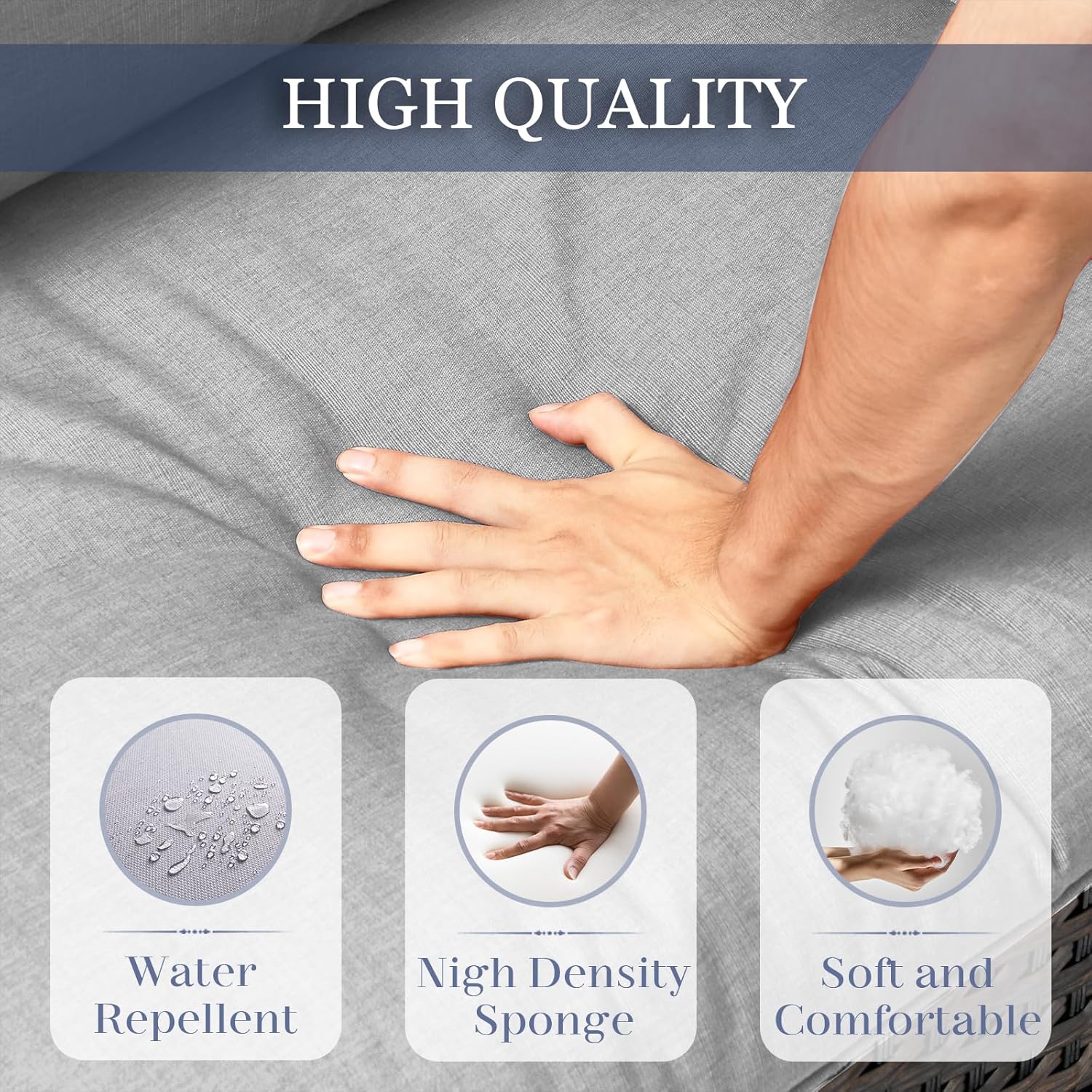 - Thick Cushions for Lasting Comfort and Support: These 4-inch thick cushions are filled with high-density resilient sponge, providing excellent support and long-lasting comfort. The wide seating design ensures plenty of space to relax, while the cushions retain their shape and bounce back after each use, never compressing. Perfect for outdoor lounging, these cushions offer both softness and durability, giving you a superior seating experience for years to come.