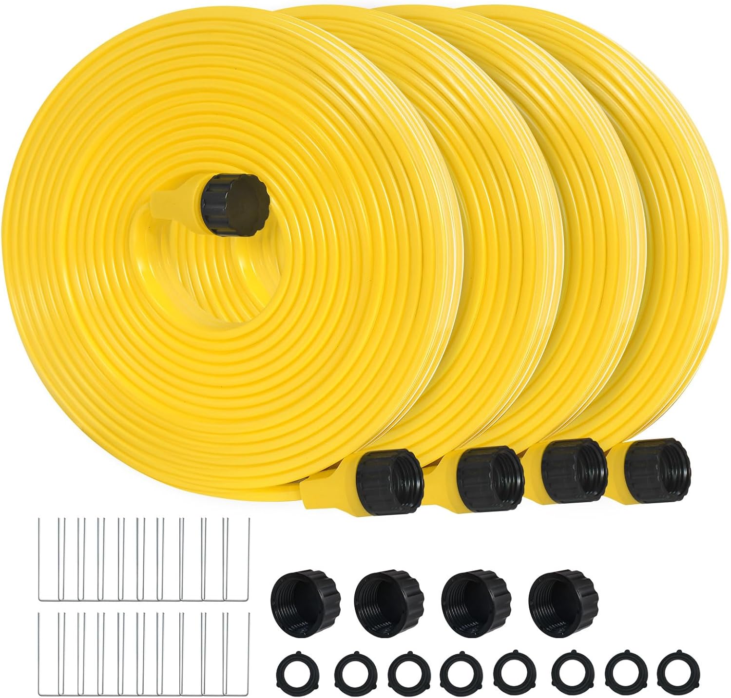 - Hassle-Free Installation and Flexibility: Designed for simplicity, the sprinkler soaker hose features a standard 3/4" connector for easy attachment to faucets, garden hoses, or splitters. Included rust-resistant stakes securely hold the hose in place, preventing tangling or shifting during use. Lightweight and flexible, it’s easy to deploy, maneuver around obstacles, and roll up for compact storage.