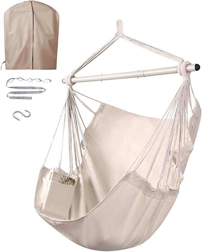 - Versatile Indoor & Outdoor Use: This hammock chair swing is perfect for various settings, from your living room and bedroom to the outdoor patio, balcony, or porch. It’s foldable, making it easy to store when not in use, while the included waterproof cover ensures protection from the elements when left outdoors